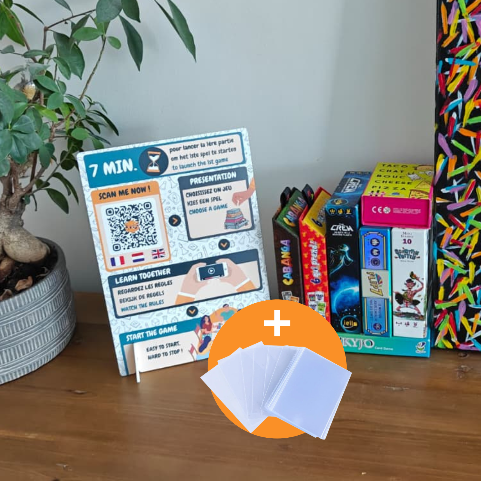- Un présentoir renvoyant les joueurs sur notre site pour y choisir le jeu à jouer, y trouver des règles en vidéos, des astuces ainsi que pleins de réponses à des questions fréquentes.